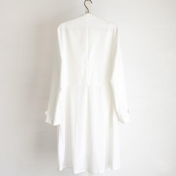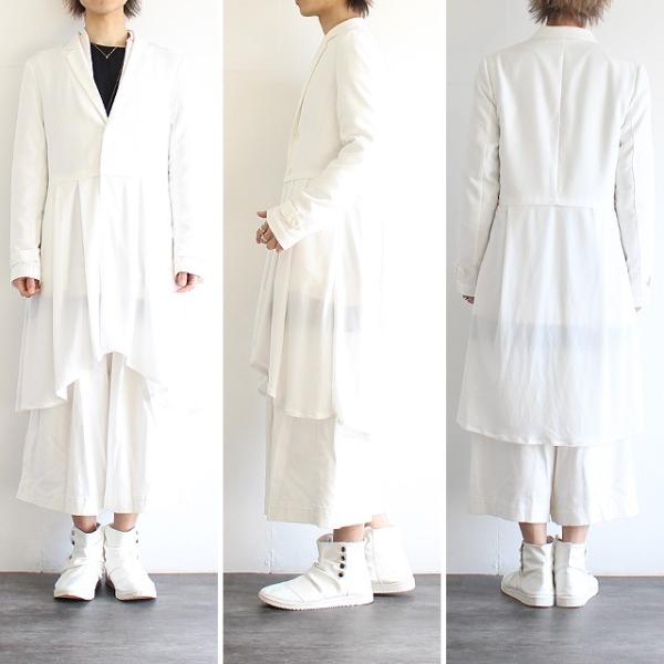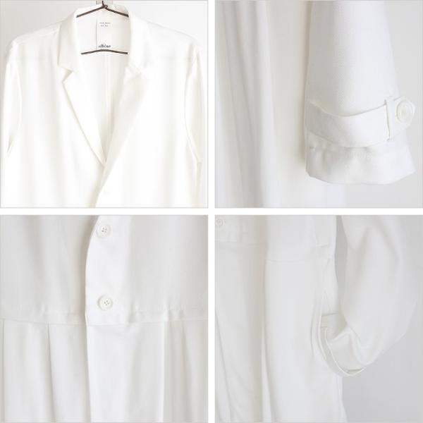 【商品説明】 スカートとテーラードの重ね着感を異素材で表現したロングジャケットです。 ベースのテーラード部分には上質な日本製混紡素材によるしなやかな落ち感のとろみ生地を採用しており、 程良く張りのある風合いと滑らかな肌触りで快適な着心地を実現しています。 スカートがモチーフの下部は日本製の上質で柔らかな肌触りと張りのある生地で切り替えていて、 ポリウレタン混紡によるストレッチ感とプリーツによる自然なドレープを生み出しています。 ボタンを留めればプリーツの利いたスカートを穿いている様な印象になり、 外せば長短差のある異素材ジャケットを重ね着している様な感覚で着こなせます。 テーラードに於いて代表的な襟である「ノッチドラペル」によるキレイめな仕上がりで、 手元の飾りベルトと相まってフォーマルなシーンでも着用出来る様なキッチリ感を醸し出しています。 ロング丈の縦長ラインを活かして細身でスッキリとしたシルエットで、 ウエスト・アーム共に体に馴染んでくれるスリムなフィット感となっています。 フロント両サイドには深く大きめのポケットをさりげなく用意しており、 全体のデザイン性に調和する様な機能性にも配慮しています。 インナーにドレスシャツ等を合わせるとドレスアップされたシックな雰囲気で、 カットソーを合わせればモードでありながら抜け感のあるラフさも演出してくれます。 スキニー・レギンス系と合わせてスッキリとしたIラインスタイルはもちろん、 ワイドパンツやスカート等ボリューム感あるボトムスとのAラインスタイルもオススメです。 ショートジャケットにプリーツスカートを合わせた様な完成されたトータルバランスで、 マニッシュ・フェミニンどちらの雰囲気も表現出来る上品な1着です。