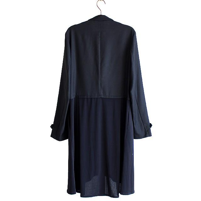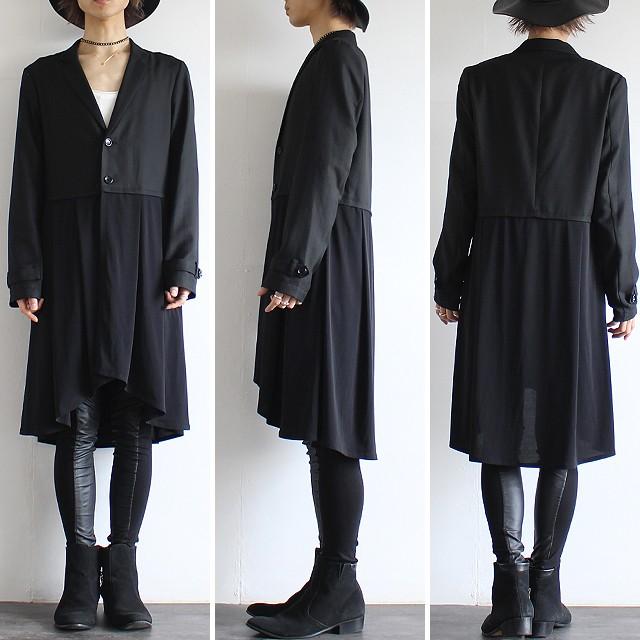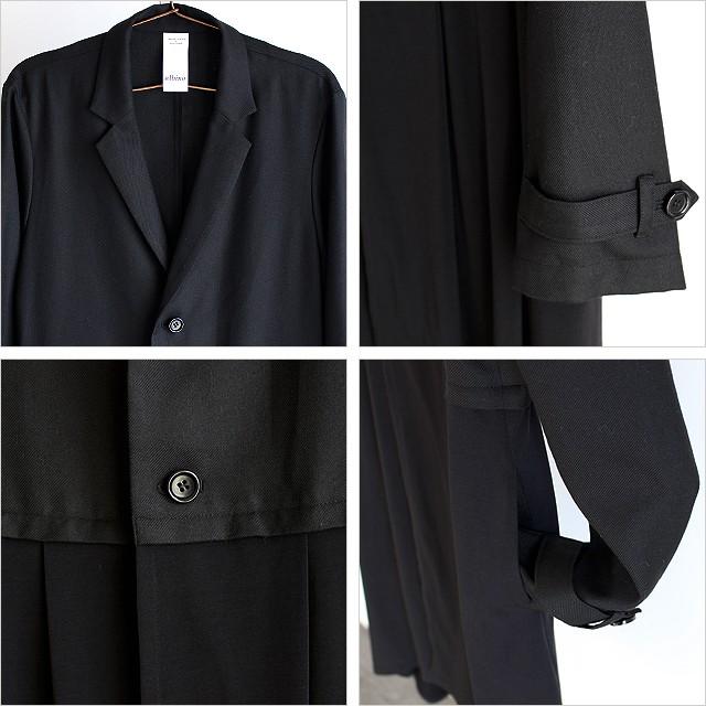 【商品説明】 スカートとテーラードの重ね着感を異素材で表現したロングジャケットです。 ベースのテーラード部分には上質な日本製混紡素材によるしなやかな落ち感のとろみ生地を採用しており、 程良く張りのある風合いと滑らかな肌触りで快適な着心地を実現しています。 スカートがモチーフの下部は日本製の上質で柔らかな肌触りと張りのある生地で切り替えていて、 ポリウレタン混紡によるストレッチ感とプリーツによる自然なドレープを生み出しています。 ボタンを留めればプリーツの利いたスカートを穿いている様な印象になり、 外せば長短差のある異素材ジャケットを重ね着している様な感覚で着こなせます。 テーラードに於いて代表的な襟である「ノッチドラペル」によるキレイめな仕上がりで、 手元の飾りベルトと相まってフォーマルなシーンでも着用出来る様なキッチリ感を醸し出しています。 ロング丈の縦長ラインを活かして細身でスッキリとしたシルエットで、 ウエスト・アーム共に体に馴染んでくれるスリムなフィット感となっています。 フロント両サイドには深く大きめのポケットをさりげなく用意しており、 全体のデザイン性に調和する様な機能性にも配慮しています。 インナーにドレスシャツ等を合わせるとドレスアップされたシックな雰囲気で、 カットソーを合わせればモードでありながら抜け感のあるラフさも演出してくれます。 スキニー・レギンス系と合わせてスッキリとしたIラインスタイルはもちろん、 ワイドパンツやスカート等ボリューム感あるボトムスとのAラインスタイルもオススメです。 ショートジャケットにプリーツスカートを合わせた様な完成されたトータルバランスで、 マニッシュ・フェミニンどちらの雰囲気も表現出来る上品な1着です。
