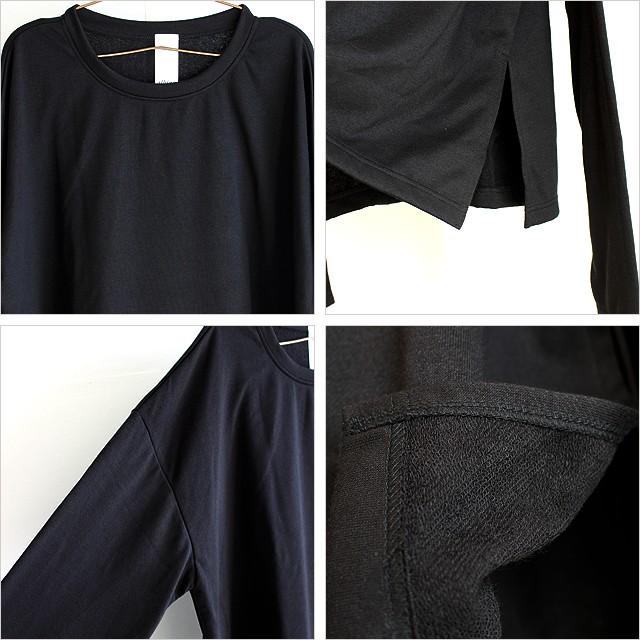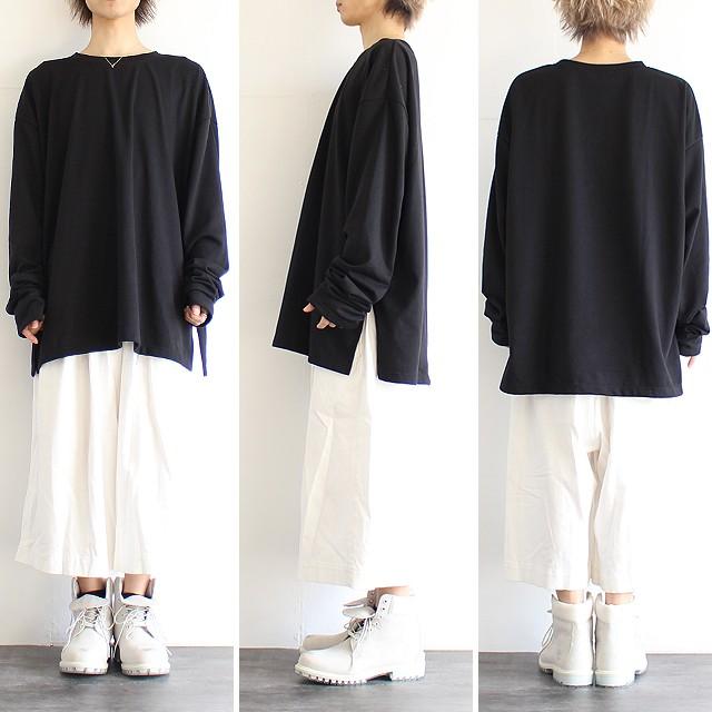 【商品説明】 ダボっとしたルーズな袖が絶妙にゆるい雰囲気のスウェットです。 上質な日本製ポリエステル×コットンの混紡素材が柔らかな肌触りで、 薄手に仕上げた軽い裏毛の優しい生地感が快適な着心地を実現しています。 敢えて着丈とほぼ同サイズにした袖はワンポイントとして存在感あるロングデザインで、 ミニマルに纏めた全体に手元からクシュッとしたアクセントを生んでくれます。 ドロップショルダーを採用する事でフェミニンな雰囲気を演出し、 肩から袖の落ち感によってビッグシルエット特有のゆるさを更に引き立てています。 全体にメリハリを出す為にザックリとサイドスリットを施していて、 オーバーサイズのワイドボディを出来るだけ野暮ったくならない様に仕上げました。 スキニー・レギンス系を合わせて上下のシルエットに差を出すのはもちろん、 ワイド系のボトムスと合わせて更にラフでゆるいスタイルを表現するのもオススメです。 カーデ等軽い羽織りを合わせたりシャツを中に着て雰囲気を変えたり、 レイヤードのベースアイテムとして幅広く活躍してくれる着回し力の高い1枚です。