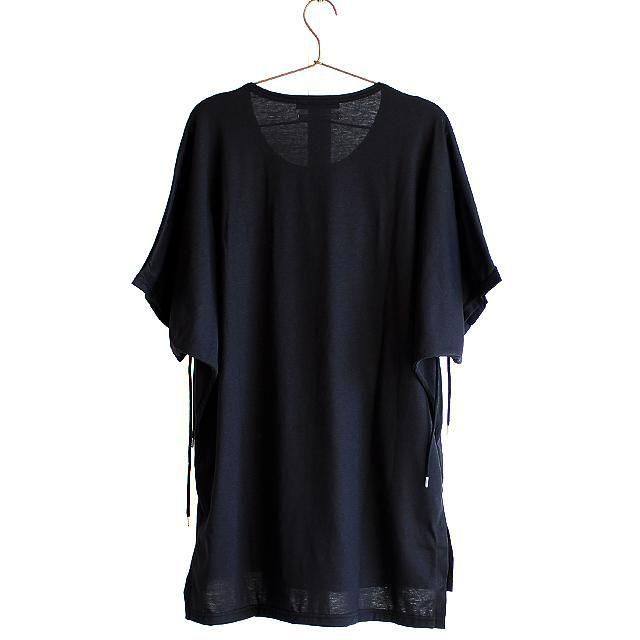【商品説明】 ドルマン特有のワイドボディに沿って施された編み上げが存在感抜群のカットソーです。 上質な日本製の混紡素材で適度に伸縮性のある柔らかな肌触りが実現されており、 程良い光沢感と軽やかな生地感で上品な着心地を感じられます。 大胆に横一線で施された編み上げがインパクトを与えてくれ、 太めの編み紐や金具のシルバーとの絶妙なメリハリが生まれています。 たっぷりと余裕のあるボディに加えドルマンスリーブが絶妙なルーズ感を演出していて、 シンプルに合わせるだけでこなれ感あるラフスタイルを表現出来ます。 ザックリと施されたサイドスリットが全体のアクセントになっており、 前後の着丈違いと併せてデザイン性の高い仕上がりになっています。 レディース着用であれば1枚着でそのままチュニックとしても活躍してくれ、 カーデやパーカーを合わせればインナーとしてロングシーズン着回せる1枚です。 スキニー・レギンス系との組み合わせでゆるシルエットを強調させるのはもちろん、 ボリュームのあるボトムスと合わせてトータルでルーズに纏めるのもオススメです。