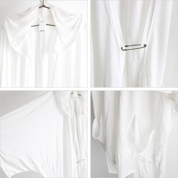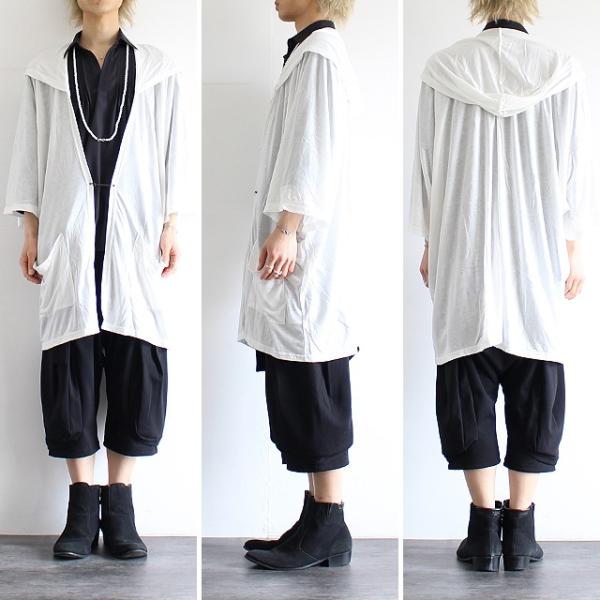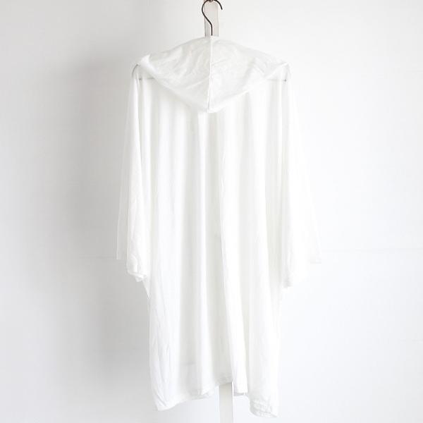 【商品説明】 独特のゆるシルエットにアンティークピンがさりげなく光るカーディガンです。 滑らかでテロッとした絶妙な落ち感のある上質な日本製レーヨン素材を採用しており、 薄く軽い生地感と適度なストレッチが快適な着心地と絶妙なゆる感を演出してくれます。 ワンポイントとして存在感を発揮しているアンティークピンがさりげない輝きを放ち、 独特の風合いがモノトーンとの上品なコントラストを生んでいます。 ボディ中央部分には針を通す為のピンホールを予め用意してあり、 ピンをデザインに取り入れた洋服にありがちな生地の傷みを予防出来る様に配慮しています。 頭がすっぽり隠れるくらいのビッグフードがアクセントとして利いていて、 バックスタイルにもしっかり配慮したデザインに仕上げています。 フロント両サイドにはドレープの利いた広く深いポケットを取り付けていて、 デザイン性だけでなく手の収まり所としての機能性にもこだわったディテールに仕上げています。 ドルマンスリーブを採用する事でフェミニンな雰囲気を醸し出しており、 肩から袖の落ち感によってワイドボディ特有のゆるさをより高めています。 メンズ・レディースどちらの着用でも5分袖から7部袖程のラフな丈感で、 たっぷり幅広にデザインした袖口によって肌離れが良いので夏でも軽い羽織りとして着回せます。 スキニー・レギンス系と合わせてワイドシルエットを活かしたメリハリを出すのはもちろん、 ボリュームのあるボトムスと合わせてトータルでゆるく着こなすスタイルもオススメです。 シャツの上から羽織ってキレイめに纏めたりロングタンクの上からラフに羽織ったり、 幅広いスタイルでロングシーズン活躍してくれる1枚です。
