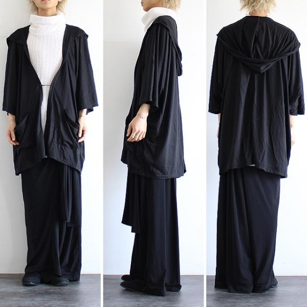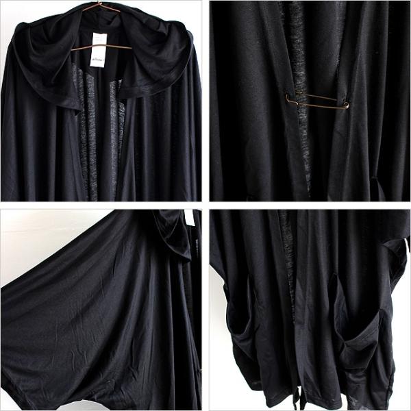 【商品説明】 独特のゆるシルエットにアンティークピンがさりげなく光るカーディガンです。 滑らかでテロッとした絶妙な落ち感のある上質な日本製レーヨン素材を採用しており、 薄く軽い生地感と適度なストレッチが快適な着心地と絶妙なゆる感を演出してくれます。 ワンポイントとして存在感を発揮しているアンティークピンがさりげない輝きを放ち、 独特の風合いがモノトーンとの上品なコントラストを生んでいます。 ボディ中央部分には針を通す為のピンホールを予め用意してあり、 ピンをデザインに取り入れた洋服にありがちな生地の傷みを予防出来る様に配慮しています。 頭がすっぽり隠れるくらいのビッグフードがアクセントとして利いていて、 バックスタイルにもしっかり配慮したデザインに仕上げています。 フロント両サイドにはドレープの利いた広く深いポケットを取り付けていて、 デザイン性だけでなく手の収まり所としての機能性にもこだわったディテールに仕上げています。 ドルマンスリーブを採用する事でフェミニンな雰囲気を醸し出しており、 肩から袖の落ち感によってワイドボディ特有のゆるさをより高めています。 メンズ・レディースどちらの着用でも5分袖から7部袖程のラフな丈感で、 たっぷり幅広にデザインした袖口によって肌離れが良いので夏でも軽い羽織りとして着回せます。 スキニー・レギンス系と合わせてワイドシルエットを活かしたメリハリを出すのはもちろん、 ボリュームのあるボトムスと合わせてトータルでゆるく着こなすスタイルもオススメです。 シャツの上から羽織ってキレイめに纏めたりロングタンクの上からラフに羽織ったり、 幅広いスタイルでロングシーズン活躍してくれる1枚です。