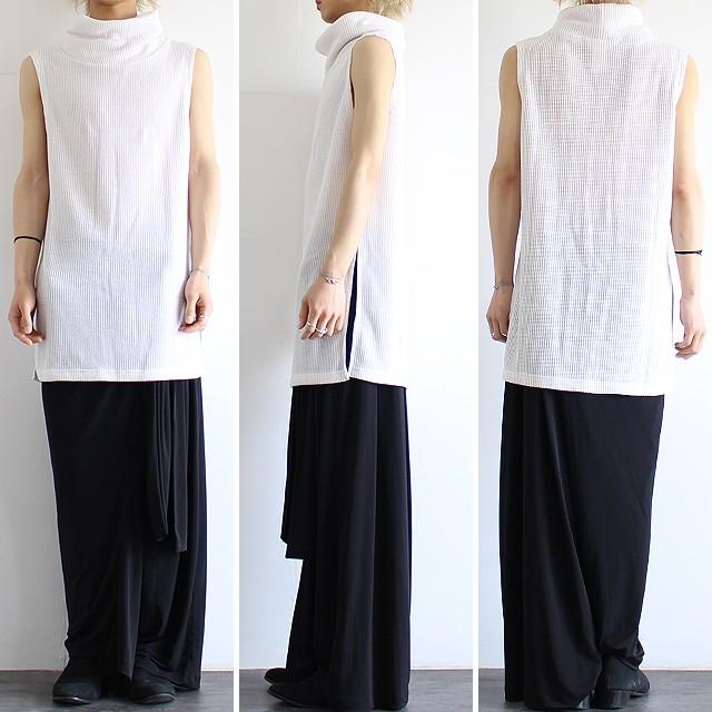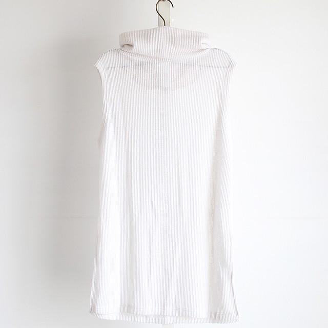 【商品説明】 首元のゆる感とスッキリ綺麗な縦長ラインが絶妙なバランスのニットソーです。 アクリルをベースにした日本製の上質な混紡素材がさりげない光沢感を生み出しており、 凹凸感のある表情豊かな生地が肌離れの良い軽い着心地を実現しています。 かぎ編みによる適度な透け感が軽やかな印象を与えてくれ、 サラッとシンプルに1枚着でもこなれ感ある雰囲気を表現出来ます。 たっぷりとボリュームのあるオフタートルネック仕様で、 首元から絶妙なラフ感を演出してくれます。 両サイドにはザックリと深いスリットを施す事で動き易さを確保するのに加え レイヤードに適していたりパンツのポケットを隠さない等デザイン性・機能性共に配慮しています。 スッキリとした細身シルエットによるシャープなロング丈で、 1枚着はもちろんカットソーやシャツの上にレイヤードで合わせればロングシーズン着回せます。 上品な雰囲気にノースリーブ特有の軽快さをバランス良くMIXさせていて、 シーンを問わずスタイリッシュな雰囲気を表現出来るオススメの1枚です。
