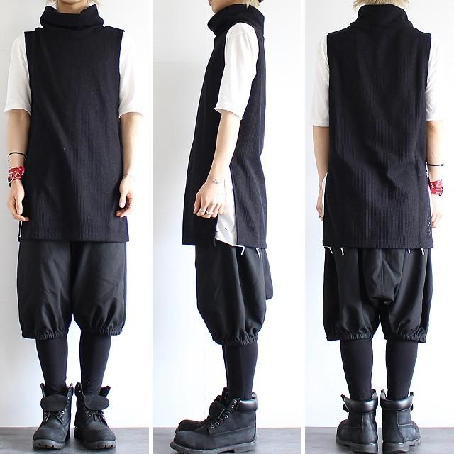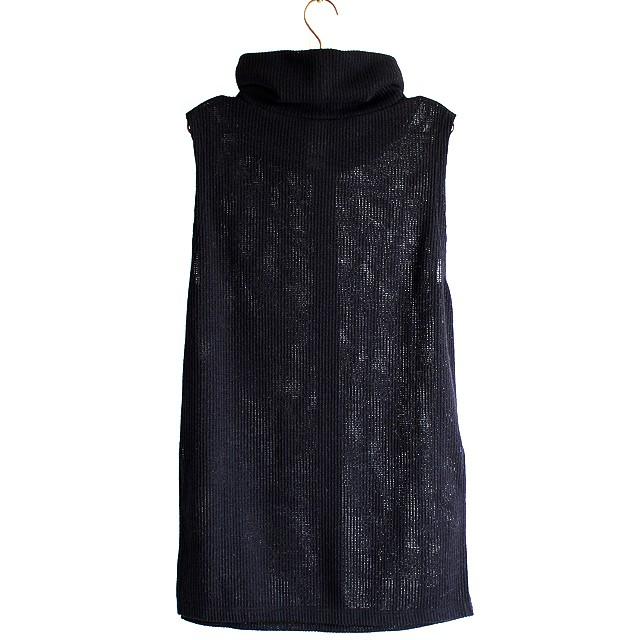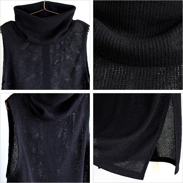 【商品説明】 首元のゆる感とスッキリ綺麗な縦長ラインが絶妙なバランスのニットソーです。 アクリルをベースにした日本製の上質な混紡素材がさりげない光沢感を生み出しており、 凹凸感のある表情豊かな生地が肌離れの良い軽い着心地を実現しています。 かぎ編みによる適度な透け感が軽やかな印象を与えてくれ、 サラッとシンプルに1枚着でもこなれ感ある雰囲気を表現出来ます。 たっぷりとボリュームのあるオフタートルネック仕様で、 首元から絶妙なラフ感を演出してくれます。 両サイドにはザックリと深いスリットを施す事で動き易さを確保するのに加え レイヤードに適していたりパンツのポケットを隠さない等デザイン性・機能性共に配慮しています。 スッキリとした細身シルエットによるシャープなロング丈で、 1枚着はもちろんカットソーやシャツの上にレイヤードで合わせればロングシーズン着回せます。 上品な雰囲気にノースリーブ特有の軽快さをバランス良くMIXさせていて、 シーンを問わずスタイリッシュな雰囲気を表現出来るオススメの1枚です。