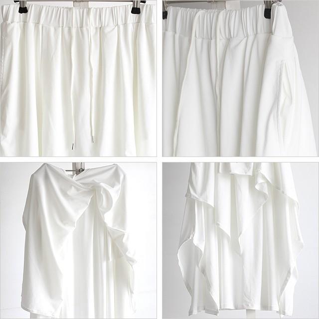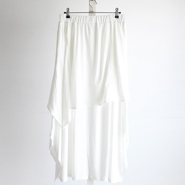 【商品説明】 優雅なドレープがたっぷり利いた重ね着デザインのロングスカートです。 日本製の上質で柔らかな肌触りと張りのあるさりげない光沢が上品な印象の生地感で、 ポリウレタン混紡による適度なストレッチで快適な穿き心地を実現しています。 ロングスカートをベースに丈の短い巻きスカートをドッキングしていて、 この1本で完成されたスタイリングが可能なフェイクレイヤードデザインに仕上げました。 両サイドにスリットを施す事で適度にフェミニンなニュアンスを醸し出しており、 動きのあるドレープと相まって軽快で優雅な印象を与えてくれます。 ウエストはリラックス感のあるゴム仕様をベースにドローコードによる調整も可能で、 デザイン性を追求しながらもラフに着回せるように配慮しています。 フロント両サイドのポケットは深く大きめに用意しているので、 機能性においても抜かりなく使いやすさを追求しています。 独創的でありながらプレーンなデザインなのでトップスの種類を選ばず満遍無くマッチしてくれる事に加え、 春・夏・秋はもちろん下にレギパンを重ね着すればオールシーズン活躍してくれる万能の1本です。