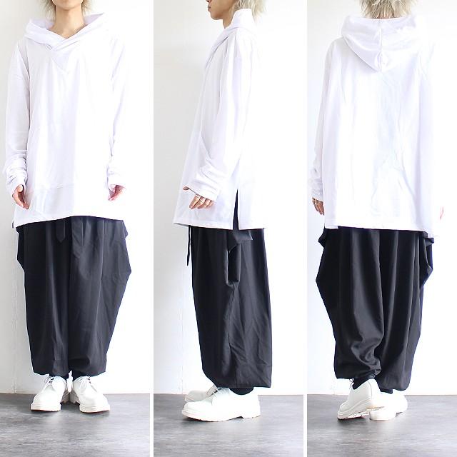 【商品説明】 特殊なVネックとたっぷりボリュームのルーズスリーブが特長的なビッグパーカーです。 上質な日本製ポリエステル×コットンの混紡素材が柔らかな肌触りで、 薄手に仕上げた軽い裏毛の優しい生地感が快適な着心地を実現しています。 ネック部分は生地を重ねてクロスさせた特殊なVネックに仕上げており、 バランスの整ったさりげないディテールにこだわっています。 敢えて着丈とほぼ同サイズにした袖はワンポイントとして存在感あるロングデザインで、 ミニマルに纏めた全体に手元からクシュッとしたアクセントを生んでくれます。 ドロップショルダーを採用する事でフェミニンな雰囲気を演出し、 肩から袖の落ち感によってビッグシルエット特有のゆるさを更に引き立てています。 全体にメリハリを出す為にザックリとサイドスリットを施していて、 オーバーサイズのワイドボディを出来るだけ野暮ったくならない様に仕上げました。 フロントには間口が大きく存在感のあるカンガルーポケットを施しており、 プルオーバーパーカーの特長をシンプルに取り入れています。 首元からボリューム感を出してくれるビッグフードをアクセントにしていて、 バックスタイルも抜かり無くデザイン性を追及しています。 メンズ・レディース共にゆったりとした長袖の着用感で、 袖口のたっぷりとした生地がこなれ感を演出してくれます。 ボトムスのシルエットによって雰囲気が変わる事に加え羽織り系のインナーとしても活躍してくれ、 モード以外にもカジュアルからストリートまでどのスタイルにもマッチする着回し抜群の1枚です。