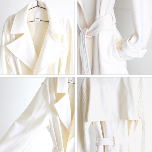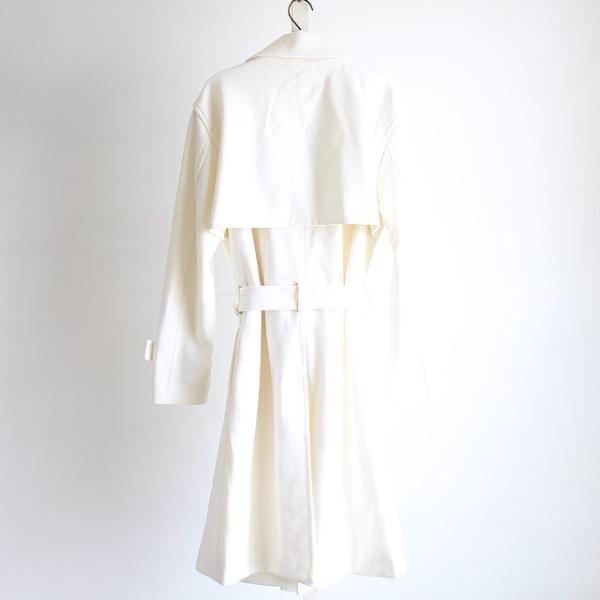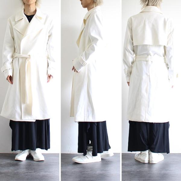 【商品説明】 随所にトレンチコートをモチーフにしたデザインを採用したガウンタイプのウールコートです。 表地は保温性抜群の上質で高密度な日本製ウールメルトン生地を採用しており、 裏地はポリエステルを使用する事により滑らかで快適な着心地を実現しています。 ラップコートとはボタンやZIP等を用いず体に巻き付ける様に前部を深く打ち合わせて着用するコートの事で、 巻き付けた上から同素材のサッシュベルト等で留める物が多いアウターの一種です。 定義通りコート本体と同素材のウールベルトをボディに用意したループに通していて、 前身で結ぶとアルファベットの「X」の様なラインが作れる事でエレガントなしなやかさが生まれます。 ベルトは結ばずフロントオープンにした状態での着回しアレンジも出来、 ワイドボディの特長が押し出されたゆるいAラインとしてまた少し違った雰囲気に変えられます。 ボディとは対照的に袖は抑えを利かせたやや細身のラインに設定しており、 スッキリと体に馴染んでくれるスリムなフィット感となっています。 トレンチコートがモチーフの「大振りなカラー(襟)」「バックのヨーク」「袖口ベルト」をワンポイントとしつつ、 チンストラップやエポレットは敢えて排除する事でクラシカルでありながらミニマルなディテールを目指しました。 フロント両サイドのポケットは深く大きめに用意しており、 左内胸ポケットと併せて全体のデザイン性に調和する様な機能性にも配慮しています。 スキニー・レギンス系と合わせて上下のシルエットにメリハリを出すスタイルはもちろん、 ワイドパンツやスカートと合わせてトータルでゆるい雰囲気を表現するスタイルもオススメです。 独創的なロングシルエットとボリュームでエッジの利いた存在感を存分に発揮してくれ、 メインのヘビーアウターとして寒い時期に大活躍してくれる1着です。