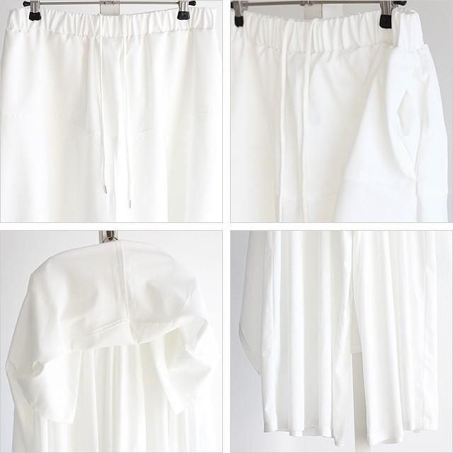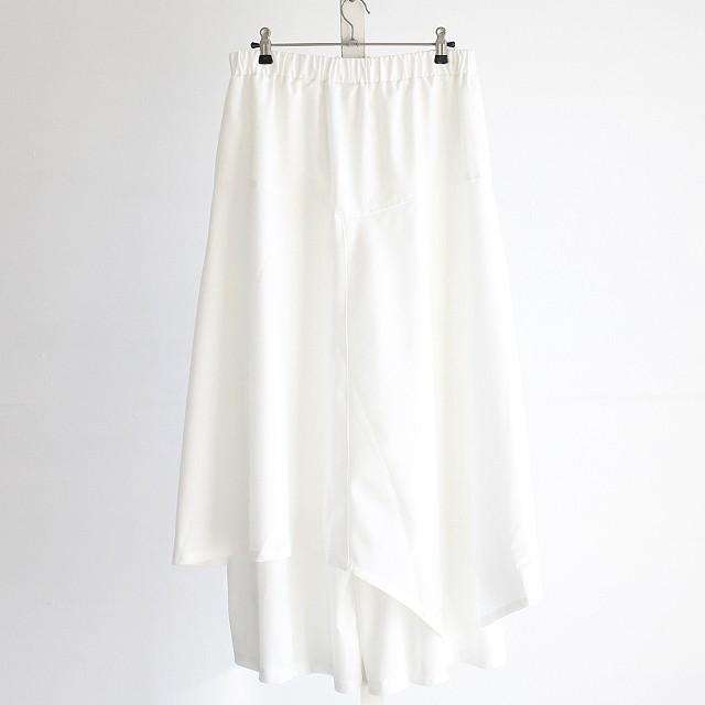 【商品説明】 さりげない変形デザインのロングスカートをドッキングさせたワイドパンツです。 ベースとなるワイドパンツ部分は日本製の上質で柔らかな肌触りと自然に出てくれるドレープの利いた生地感で、 ポリウレタン混紡による適度なストレッチで快適な穿き心地を実現しています。 上に重ねているスカート部分は上質な日本製の混紡素材が適度にしなやかな肌触りを実現しており、 程良い光沢感と張りのある風合いでスーツ地特有の上品な雰囲気に仕上げています。 ワイドパンツをベースに左右で長さを変えたアシメロングスカートをドッキングしていて、 この1本で完成されたスタイリングが可能なフェイクレイヤードデザインに仕上げました。 同じカラーでも生地感を切り替える事でメリハリを生み出し、 素材的にも視覚的にも絶妙なニュアンスの違いを表現しています。 程良く立体感を出す為に施したスカート表面のシーム(縫い目)がさりげないワンポイントとなっており、 動きのあるドレープと相まってこだわりが感じられる優雅な印象を与えてくれます。 ウエストはリラックス感のあるゴム仕様をベースにドローコードによる調整も可能で、 デザイン性を追求しながらもラフに着回せるように配慮しています。 フロント両サイドには深く大きめのポケットを用意し、 機能性においても抜かり無く使い易さを追求しています。 一見するとボリュームの有るロングスカートですがデザイン的にはパンツに分類されるので、 スカートに抵抗感がある方でも難無く取り入れられるオススメの1本です。