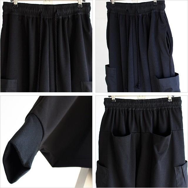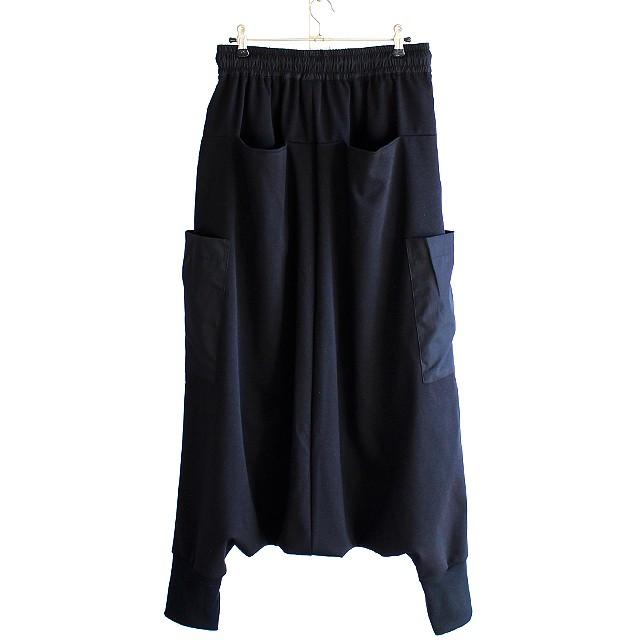 【商品説明】 存在感抜群の股上の深さとアクセントとして取り付けた異素材ポケットが特長のサルエルパンツです。 本体は滑らかで柔らかい光沢感と絶妙なとろみが感じられる上質な混紡素材による日本製で、 適度に薄く軽い生地感と横方向にストレッチが利いた快適な穿き心地に仕上げています。 両サイドのパッチポケットにはポリエステルベースのシャリッとした生地を採用し、 生地を切り替える事で同色でも質感にメリハリを出しています。 サルエルの特長を最大限に活かして「総丈とほぼ同じ長さ」に設定したかなり深い股上に加え、 パッチポケットが存在感抜群の独特なルーズ感にさりげないアクセントとして更に個性を際立たせてくれます。 リブ裾にロングデザインを採用する事で絶妙にスッキリとしたバランスが生まれ、 足首部分を引き締める事でより綺麗なボリュームシルエットを実現させました。 ウエストゴムはギャザーにする事で引き締まった印象を与えてくれて、 サイズ調整可能な太目のねじれドローコードと相まってリラックス感がありながらもシックな雰囲気を目指しました。 本体のフロント両サイドとバックには深く大きめのポケットを用意しているので、 デザイン性はもちろん合計6個の高い収納力によって機能性にも優れています。 基本的にはシンプルにそのまま穿くだけで相当インパクトのあるシルエットですが、 リブを活かして裾を引き上げる事でクロップドとして穿けばまた違った雰囲気の着回しアレンジも可能です。 トップスをコンパクトにして上下でメリハリのあるAラインを打ち出すスタイルはもちろん、 敢えてロング丈やドルマン等でトップスにもボリュームを持たせてトータルでルーズに纏めるスタイルもオススメです。