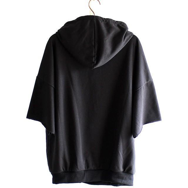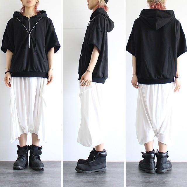 【商品説明】 ラフな生地感に二重構造で仕上げたZIPネックが映える半袖パーカーです。 上質な日本製コットンによる柔らかな肌触りを実現しており、 裏毛の優しい生地感で快適な着心地を感じられます。 ネック部分は内側と外側それぞれにZIPを施した二重構造に仕上げており、 開け閉めの具合を調節する事で簡単に違った雰囲気を演出出来ます。 ドロップショルダーを採用する事でフェミニンな雰囲気を演出し、 肩から袖の落ち感によってビッグシルエット特有のゆるさを更に引き立てています。 袖先にはほつれデザインを取り入れたこなれ感あるカットオフ加工を施していて、 ステッチでロックを掛ける事でほつれ過ぎるのを防止する様に配慮しています。 全体にメリハリを出す為に裾をリブ仕様にする事で引き締まった印象となり、 ビッグサイズのワイドボディを出来るだけ野暮ったくならない様に仕上げました。 両サイドには間口が広く深めの切れ込みポケットを用意し、 デザイン性だけでなく機能性におけるディテールも追及しています。 首元からボリューム感を出してくれるビッグフードをアクセントにしていて、 バックスタイルも抜かり無くバランスの整ったシルエットを生んでくれます。 メンズ・レディース共に幅広でゆったりした5分袖前後の丈感で、 独特の自然なゆるさとこれからの季節を意識した軽さが感じられます。 インナーに長袖トップスを合わせたレイヤードもオススメなのでロングシーズン活躍してくれ、 モードはもちろんカジュアルからストリートまでどのスタイルにもマッチする着回し抜群の1枚です。