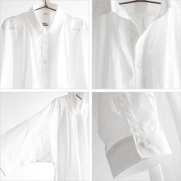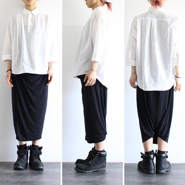 【商品説明】 タックのキッチリ感とドルマンのラフ感をMIXさせたポロモチーフのプルオーバーシャツです。 上質な日本製コットン100%による薄手で軽い着心地の生地感で、 若干のシワ加工を施した透け感のある絶妙なデザイン性を追求しています。 ポロシャツとは襟付き・ボタン有りの被りタイプシャツの事を指し、 イギリスでポロ競技の際に用いられたのが始まりとされています。 一般的には吸湿性のあるニットやタオル地等が用いられていますが、 この1枚ではシャツ感を出す為にコットンで仕上げているのでポロデザインはあくまでモチーフとして取り入れています。 ワンポイントとして胸元に施したタックが上品な印象を与えてくれ、 ボタンを外した際に出る首元の抜け感との相乗効果でより優雅な雰囲気を演出しています。 メンズ着で7分袖・レディース着で9分袖程の丈感にゆったりとしたドルマン仕様で、 キッチリ感がありながらもラフな雰囲気で合わせられる軽快なスタイリングが表現出来ます。 緩やかにラウンドした裾はさりげなく前後の着丈差を生み出していて、 ちょうどお尻が隠れるくらいの後ろ着丈がスタイル良く着こなせるポイントになっています。 前着丈は短めに設定したコンパクトシルエットなので特にボリュームのあるボトムスとの相性が良く、 スカートやワイドパンツ等に合わせれば上下それぞれの特長が引き立ちます。 シルエット・ディテール・着心地等全体のバランスを意識したデザインなので、 暑い時期でもカジュアルからフォーマルまで幅広いシーンで活躍してくれる上品な1枚です。