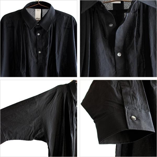 【商品説明】 タックのキッチリ感とドルマンのラフ感をMIXさせたポロモチーフのプルオーバーシャツです。 上質な日本製コットン100%による薄手で軽い着心地の生地感で、 若干のシワ加工を施した透け感のある絶妙なデザイン性を追求しています。 ポロシャツとは襟付き・ボタン有りの被りタイプシャツの事を指し、 イギリスでポロ競技の際に用いられたのが始まりとされています。 一般的には吸湿性のあるニットやタオル地等が用いられていますが、 この1枚ではシャツ感を出す為にコットンで仕上げているのでポロデザインはあくまでモチーフとして取り入れています。 ワンポイントとして胸元に施したタックが上品な印象を与えてくれ、 ボタンを外した際に出る首元の抜け感との相乗効果でより優雅な雰囲気を演出しています。 メンズ着で7分袖・レディース着で9分袖程の丈感にゆったりとしたドルマン仕様で、 キッチリ感がありながらもラフな雰囲気で合わせられる軽快なスタイリングが表現出来ます。 緩やかにラウンドした裾はさりげなく前後の着丈差を生み出していて、 ちょうどお尻が隠れるくらいの後ろ着丈がスタイル良く着こなせるポイントになっています。 前着丈は短めに設定したコンパクトシルエットなので特にボリュームのあるボトムスとの相性が良く、 スカートやワイドパンツ等に合わせれば上下それぞれの特長が引き立ちます。 シルエット・ディテール・着心地等全体のバランスを意識したデザインなので、 暑い時期でもカジュアルからフォーマルまで幅広いシーンで活躍してくれる上品な1枚です。
