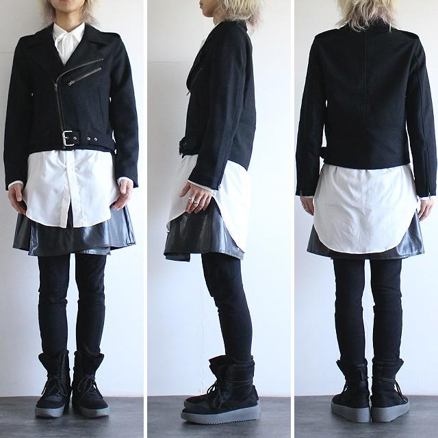 【商品説明】 ウール生地で仕上げた珍しく希少性の高いデザインのダブルライダースです。 表地は保温性抜群の上質で高密度な日本製ウールメルトン生地を採用しており、 裏地はポリエステルを使用する事により滑らかで快適な着心地を実現しています。 ダブルライダースの特長である「大振りなカラー(襟)」「エポレット」「裾ベルト」をワンポイントとしつつ、 敢えてレザーではなくウールで仕上げる事でスタンダードでありながら希少性の高いデザインを目指しました。 ZIPやベルト等各ポイントにアンティーク調の金具をあしらい、 ウール生地との質感の違いがシックなコントラストを演出しています。 細身でスッキリとした雰囲気が漂う絶妙なシルエットに仕上げており、 ウエスト・アーム共に体に馴染んでくれるスリムなフィット感となっています。 裾ベルトに加えアームZIPも用意しているのでそれぞれのポイントで多少のサイズ調整が出来、 着心地からシルエットまでさりげないディテールにもこだわっています。 フロント両サイドのポケットと左胸ZIPポケットは深く大きめに用意しており、 左胸内ポケットと併せて全体のデザイン性に調和する様な機能性にも配慮しています。 特長的なショート丈でコンパクトなシルエットをバランス良く活かす為に、 ロングスカートやワイドパンツ等のボリュームあるボトムスを合わせたAラインスタイルがオススメです。 逆にスキニー・レギンス系パンツと合わせれば綺麗なIラインによるロックテイストのスタイルを表現出来、 ワイルドな印象がありながらもどこか上品な雰囲気も漂う秋冬に大本命の1着です。