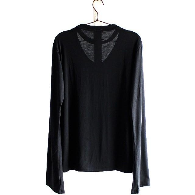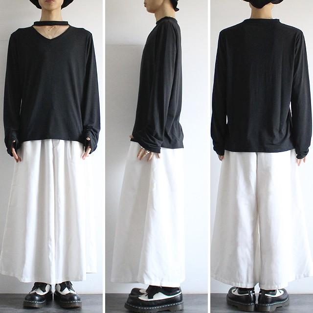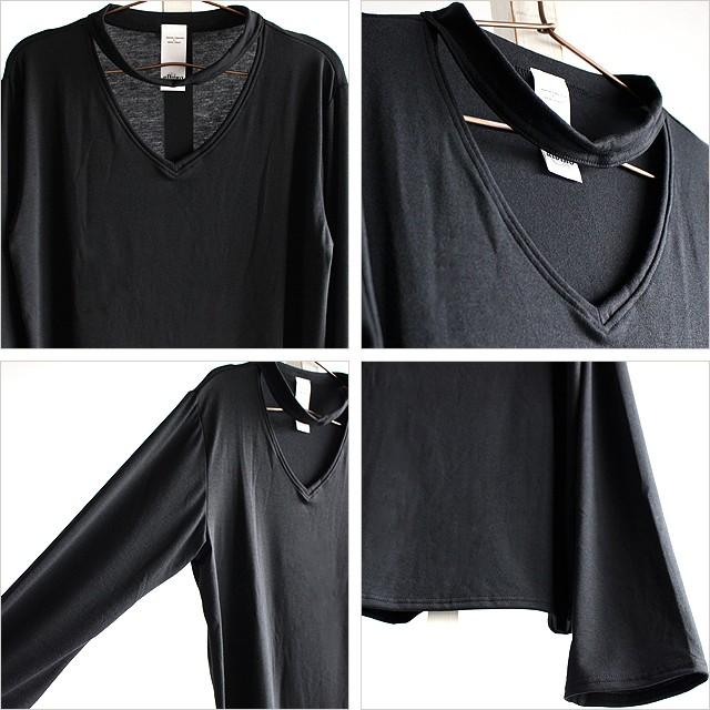 【商品説明】 チョーカーをモチーフにした独創的なネックと柔らかなベルスリーブを取り入れたカットソーです。 上質な日本製の混紡素材が適度に伸縮性のある柔らかな肌触りを実現しており、 程良い光沢感と滑らかな生地感で上品な雰囲気に仕上げています。 適度に開けたVネックをベースにチョーカーを合わせているかの様なデザインを計算した生地縫製で仕上げ、 シンプルに合わせても存在感を発揮する独創的なディテールにこだわりました。 袖先に向かって広がりを持たせたベルスリーブが手元からさりげないアクセントを生んでくれ、 自然に独特のゆるさが出てくれる様に手元の絶妙なボリューム感を追求しました。 スッキリとコンパクトな着丈に設定しているので、 ボリュームのあるボトムスを活かすスタイルでは特にマッチしてくれオススメです。 エッジの利いたワンポイントデザインに仕上げているのでシンプルに1枚着はもちろん、 カーデやジャケット等のインナーとして合わせればロングシーズン幅広く活躍してくれます。