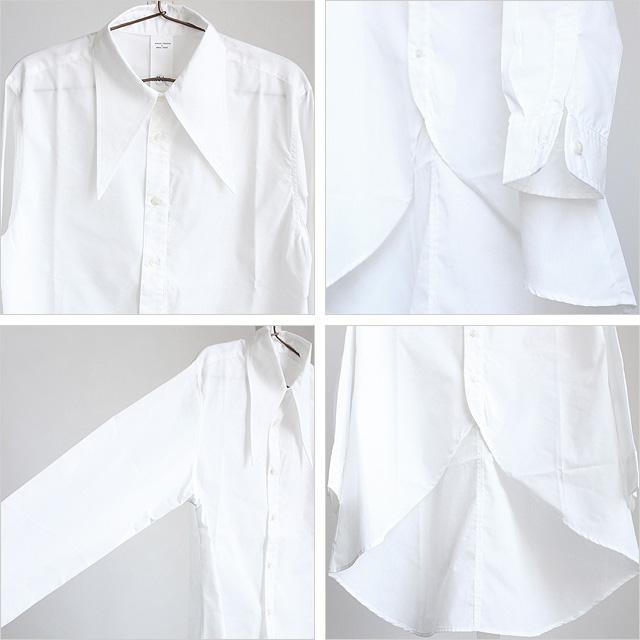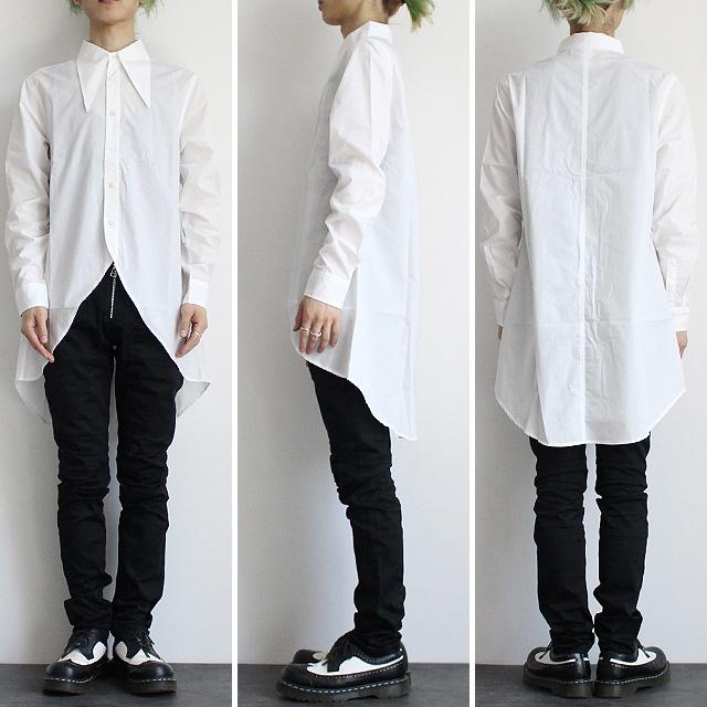 【商品説明】 特長的な長襟が存在感を放つロングテール仕様のドレスシャツです。 上質な日本製ポリエステルとコットンによる混紡素材のシャリッとした生地を採用し、 柔らかい光沢感と張りのある肌触りが上品な雰囲気を醸し出しています。 バリモアカラーとは通常より襟先が長い形状を指し、 ハリウッドスターのジョン・バリモアが着用した事に由来されています。 ワンポイントとなりながらも長過ぎて野暮ったくなる事は無い様にバランスにこだわったディテールで、 フォーマルなシーンでも活躍してくれるドレッシーな仕上がりを目指しました。 緩やかにラウンドした後ろ裾とファーブルデザインの前裾によってハッキリとした着丈差を生み出し、 程良くエッジの利いたデザイン性としてだけではなくレイヤードの際にインナーとの好バランスを生んでくれます。 袖口部分にはさりげないアクセントのダーツをあしらっていて、 立体感のあるメリハリが生まれる様に意識しています。 ボディと同カラーのボタンを採用する事で全体の統一感を高めており、 小振りなサイズ感がスッキリとした印象を与えてくれます。 スッキリとした細身シルエットはドレッシーなスタイルが特に好相性で、 ロング丈特有の縦長を活かして綺麗なボディラインを表現しました。 スキニー・レギンス系でキッチリ感が出る縦長Iラインのスタイリングはもちろん、 ワイドパンツやスカートと合わせてAラインによるメリハリを出すスタイルもオススメです。 ジャケット・ベストやコートのインナートップスとして合わせたり、 シンプルに1枚着や敢えて羽織りとしてでも存在感抜群の個性を主張してくれる幅広いシーンにオススメの1枚です。