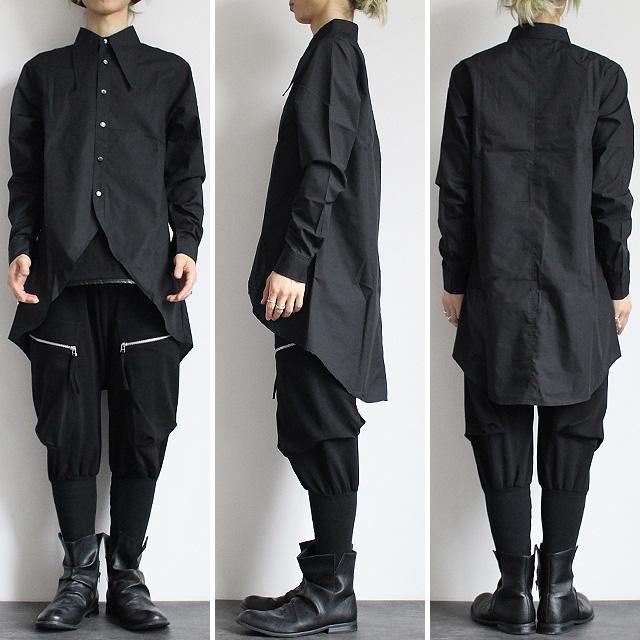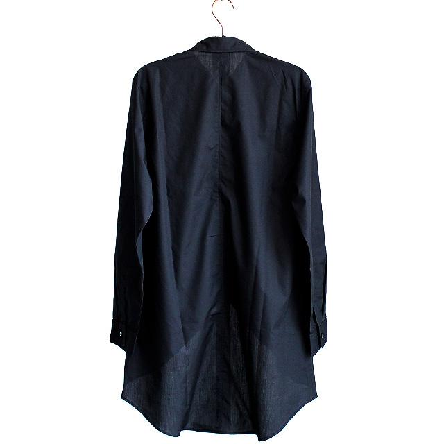 【商品説明】 特長的な長襟が存在感を放つロングテール仕様のドレスシャツです。 上質な日本製ポリエステルとコットンによる混紡素材のシャリッとした生地を採用し、 柔らかい光沢感と張りのある肌触りが上品な雰囲気を醸し出しています。 バリモアカラーとは通常より襟先が長い形状を指し、 ハリウッドスターのジョン・バリモアが着用した事に由来されています。 ワンポイントとなりながらも長過ぎて野暮ったくなる事は無い様にバランスにこだわったディテールで、 フォーマルなシーンでも活躍してくれるドレッシーな仕上がりを目指しました。 緩やかにラウンドした後ろ裾とファーブルデザインの前裾によってハッキリとした着丈差を生み出し、 程良くエッジの利いたデザイン性としてだけではなくレイヤードの際にインナーとの好バランスを生んでくれます。 袖口部分にはさりげないアクセントのダーツをあしらっていて、 立体感のあるメリハリが生まれる様に意識しています。 ボディと同カラーのボタンを採用する事で全体の統一感を高めており、 小振りなサイズ感がスッキリとした印象を与えてくれます。 スッキリとした細身シルエットはドレッシーなスタイルが特に好相性で、 ロング丈特有の縦長を活かして綺麗なボディラインを表現しました。 スキニー・レギンス系でキッチリ感が出る縦長Iラインのスタイリングはもちろん、 ワイドパンツやスカートと合わせてAラインによるメリハリを出すスタイルもオススメです。 ジャケット・ベストやコートのインナートップスとして合わせたり、 シンプルに1枚着や敢えて羽織りとしてでも存在感抜群の個性を主張してくれる幅広いシーンにオススメの1枚です。