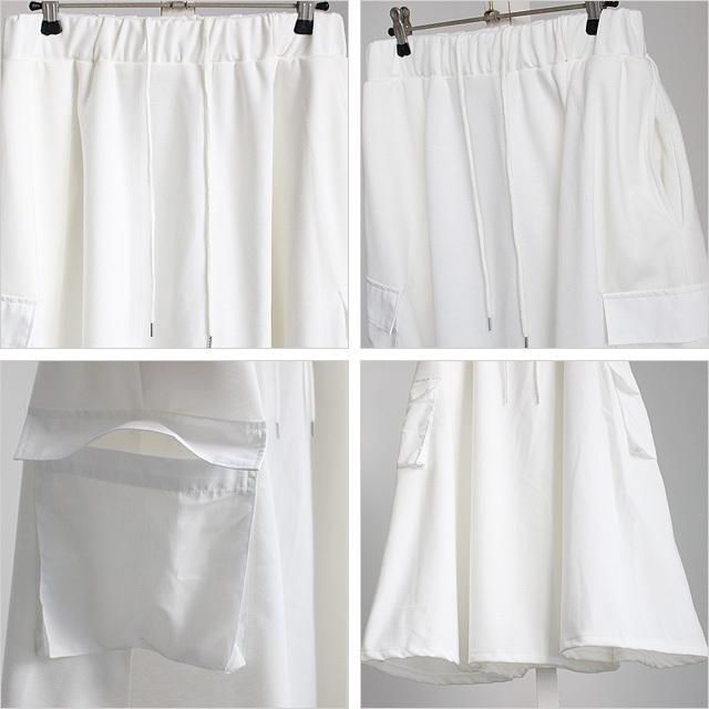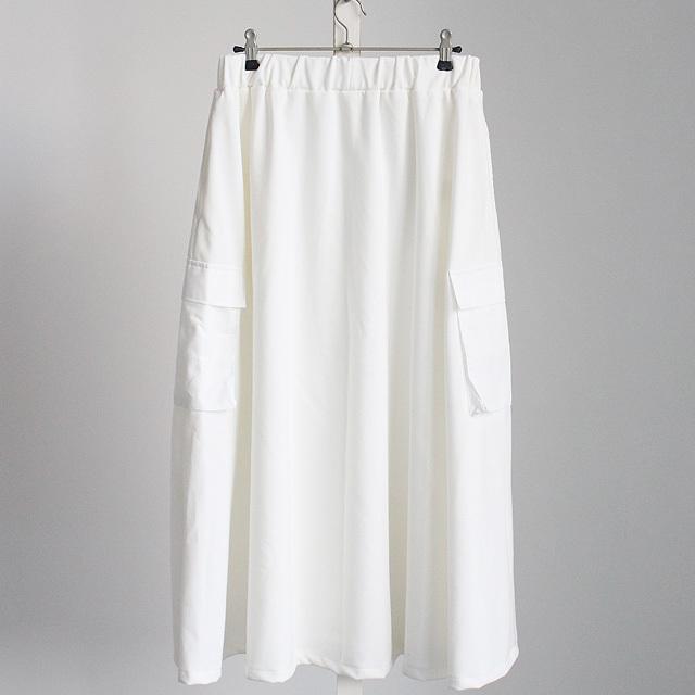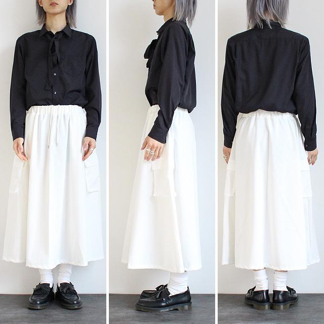【商品説明】 両サイドに施したボックス型の異素材フラップポケットが特長的なロングスカートです。 本体は滑らかで柔らかい光沢感と絶妙なとろみが感じられる上質な混紡素材による日本製で、 適度に薄く軽い生地感と横方向にストレッチが利いた快適な穿き心地に仕上げています。 両サイドのフラップポケットにはポリエステルベースのシャリッとした生地を採用し、 生地を切り替える事で同色でも質感にメリハリを出しています。 フロント両サイドにも深く大き目のポケットを用意しており、 デザイン性だけで無く使い分けも可能なバランスの取れた機能性にも配慮しています。 インパクトが有りながらもフェミニンな雰囲気やシルエットを追求し、 可憐で優雅なロング丈Aラインをエレガントに演出しています。 リラックス感のあるウエストゴムに併せてドローコードも用意しているので、 サイズ調整はもちろん垂らす事で全体のさりげないアクセントになってくれます。 フレアシルエットを活かす為にコンパクトなトップスやウエストインで合わせるスタイルはもちろん、 敢えてロング丈のトップス・アウターを合わせてトータルで存在感あるボリュームを出すスタイルもオススメです。 各ポイントでディテールワークの光る個性をさり気無く主張しており、 軽快な印象でロングシーズン活躍してくれる1本です。