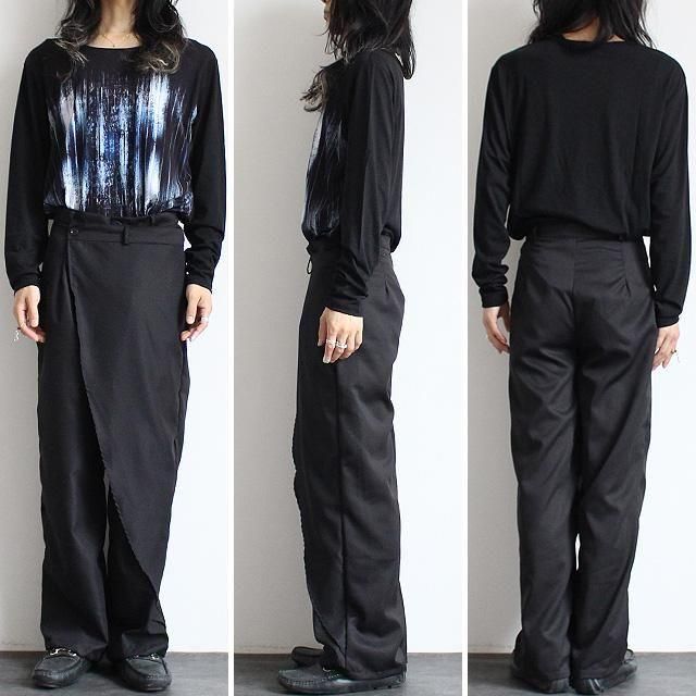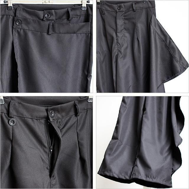 【商品説明】 巻きスカートの重ね着感が独創的な存在感を放つワイドスラックスです。 上質なポリエステルによる薄手で柔らかな肌触りが快適な肌触りを実現しており、 とろみ感の有る生地と適度な光沢が上品さを醸し出しています。 パンツ本体にエプロンスカートが繋がった一体型仕様で、 スカートパンツのモードなニュアンスが簡単に手に入ります。 左サイドから折り畳んでボタンを留める事によって巻きスカートを重ね着しているデザインを表現出来、 敢えてボタンを留めず垂らしたりその日のスタイルや気分に合わせて複数の着こなしを楽しめます。 ベルトホールが用意されたスラックスデザインがベースになっており、 綺麗な雰囲気とベルトによるサイズ調整可能な機能性を兼ね備えています。 コンパクトなトップスを合わせてスッキリとしたAラインのキレイめスタイルは勿論、 ロング丈やビッグシルエットのトップスを合わせてトータルでゆるい雰囲気に纏めるラフスタイルもオススメです。 モード・ストリート・カジュアルからフォーマル・ドレッシー・オフィスカジュアルまで様々な一面を見せてくれ、 スタイル問わず合わせ方次第でオールシーズン幅広く活躍してくれる万能な1本です。 ※こちらの商品はインポートアイテムですので、 ご注文頂いてから10日〜15日程お時間を頂きます事を予めご理解下さい。