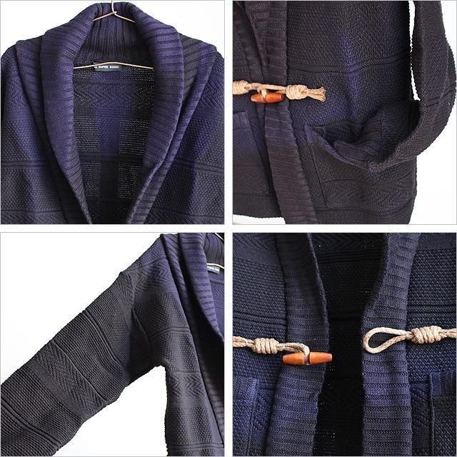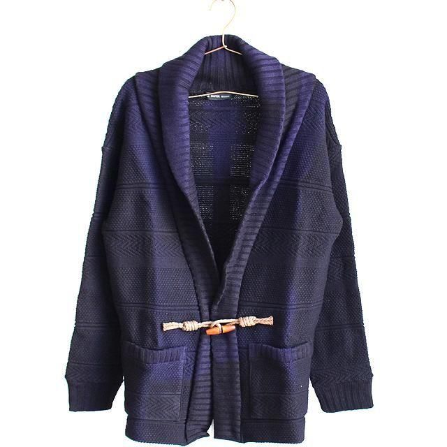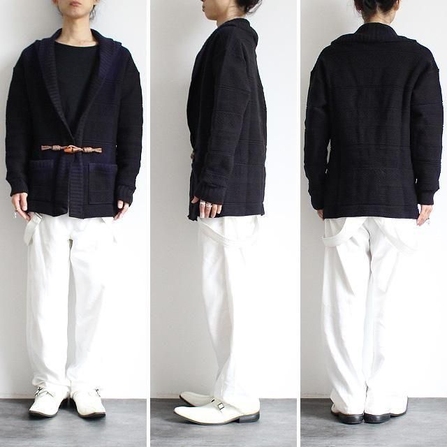 【商品説明】 ふんわり肉厚なジャガード織りニットで仕上げられたトグル仕様のショールカラーカーディガンです。 アクリルはウールや綿・シルク等より非常に軽い繊維で、 ふっくらとした肉厚で柔らかな肌触りとしっかりとした保湿性を持っています。 複雑なハイゲージで編まれたジャガード織りニットが暖かな雰囲気を更に高めてくれていて、 特長的なビッグサイズと相まって秋冬特有のゆるスタイルを表現出来ます。 サラッと羽織るだけで綺麗な形状が出てくれる様にネックラインの生地量が計算され、 ショールカラー特有の上品な雰囲気を簡単に表現出来ます。 ウッド調トグルボタンで留めるデザインをしっかりと太く編んだ麻紐と言う点でアクセントを利かせ、 本体生地との素材差異によってメリハリの有る絶妙なコントラストが生まれています。 流れる様な生地色味変化を感じられるムラ染めが施され、 ダークトーンによるシックなデザイン性の仕上がりになっています。 フロント両サイドには深く大き目のポケットが用意されていて、 デザイン性に加え機能性にも配慮された作りになっています。 スキニーと合わせて独特のワイドシルエットを強調するのは勿論、 ガウチョやワイドパンツと合わせてインパクト有る存在感を表現するのもオススメです。