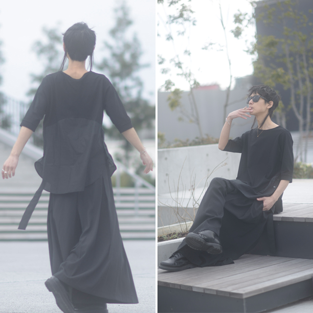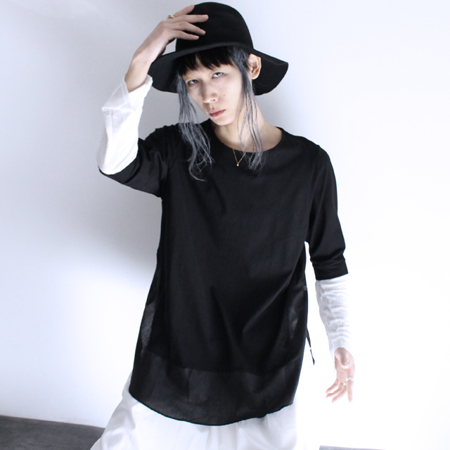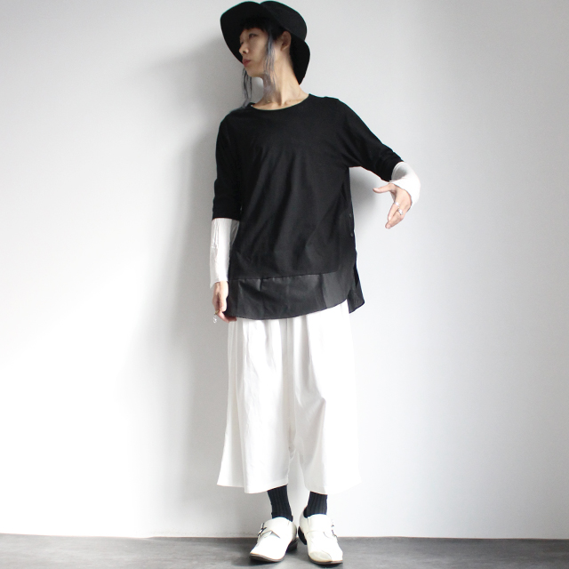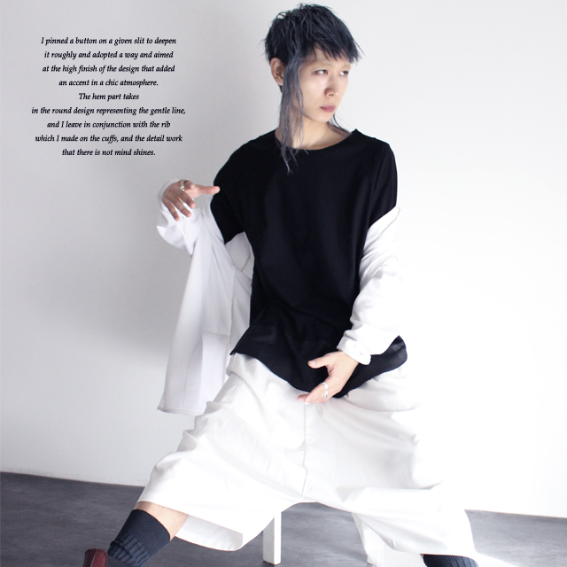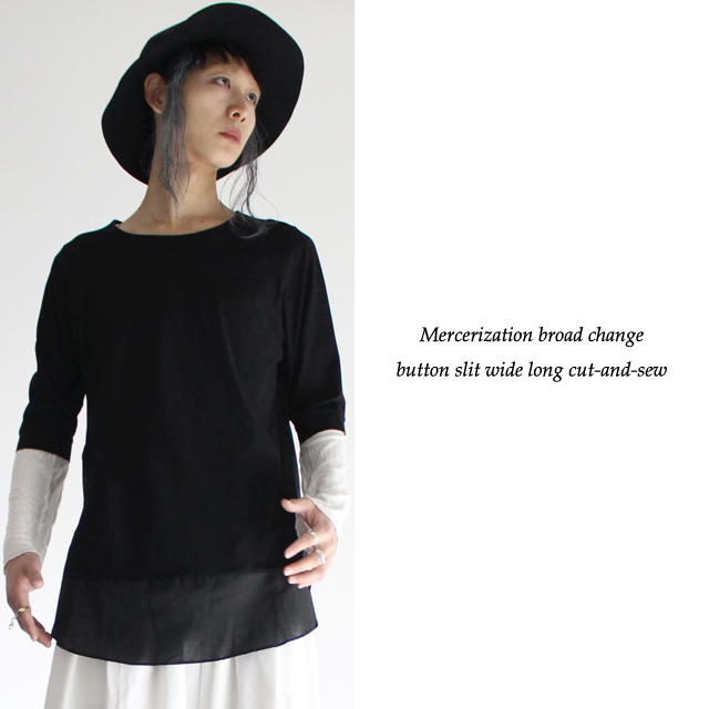 【商品説明】 シルケット加工を施した滑らか且つ上品なブロード生地で切り替えられたロング丈カットソーです。 上質な日本製コットンによって着心地の良い肌触りを実現していて、 別布の切り替え部分で生地感を変える事によりメリハリが感じられます。 ブロードとは高密度に織られた平織り生地を指し、 特殊シルケット加工を施す事でシルクの様な柔らかく滑らかで適度に光沢感の有る風合いを実現しています。 ザックリと深めに施されたスリットにはボタン留め仕様を採用しており、 シックな雰囲気の中にアクセントを加えたデザイン性の高い仕上がりを目指しました。 裾部分は緩やかなラインを描くラウンドデザインを取り入れ、 袖口に施したリブと併せてさり気無いディテールワークが光ります。 ゆったりとしたロング丈・ワイドシルエットのFREEサイズなので、 単体は勿論インナートップスとして重ね着での着こなしをユニセックスで楽しめます。 ワイドパンツやスカートを合わせてモードテイストを強調するのは勿論、 スキニー・レギンス系を合わせたストリートMIXのスタイルもオススメの1枚です。 ※こちらの商品は受注生産アイテムですので、 ご注文頂いてから10日〜15日程お時間を頂きます事を予めご理解下さい。
