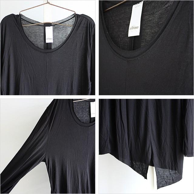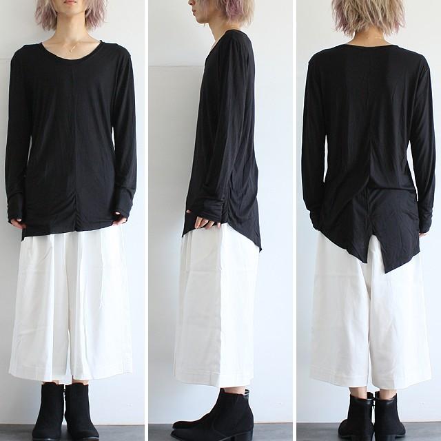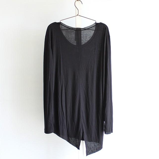 【商品説明】 大胆なカッティングを繊細な雰囲気のシルエットに仕上げたロングカットソーです。 滑らかでテロッとした絶妙な落ち感のある上質な日本製レーヨン素材を採用しており、 薄く軽い生地感と適度なストレッチが快適な着心地と絶妙なゆる感を演出してくれます。 こなれ感あるカットオフ加工を各ポイントに施していて、 特にネック部分は特有の生地先の丸まりがさりげないオシャレを演出してくれます。 ボディはフロント・バック共にセンターソーイングを取り入れており、 ワンポイントになるさりげない立体感が生まれるようにデザインしています。 全体を生地感やシルエットでシンプルにさりげないディテールに纏めながら、 アクセントのややアシメにしたW型にカットされた裾部分で大胆さと繊細さを表現しています。 全体的に長めに設定している中で特に袖丈の長さにこだわって、 ユニセックスでゆる感のある雰囲気を楽しんで貰えるように整えています。 1枚でこなれ感ある着こなしはもちろんジャケット等のインナーとしてもかなり活躍してくれ、 モノトーンスタイルのベースとして抜群にマッチするオススメの1枚です。