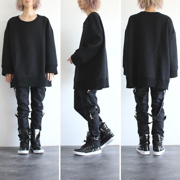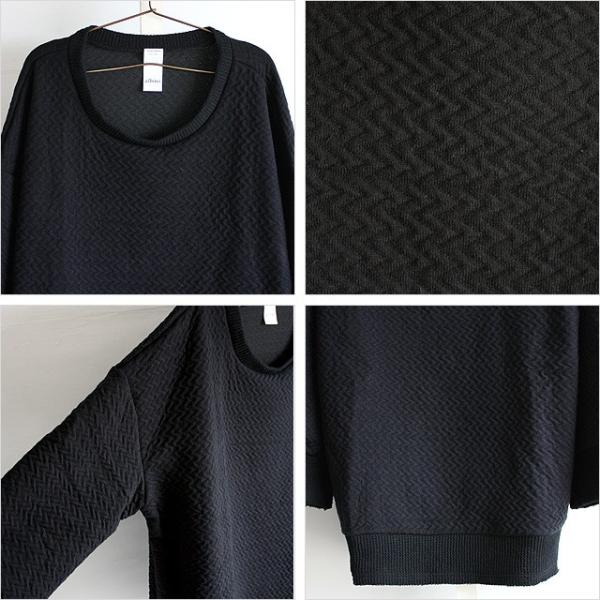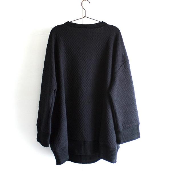 【商品説明】 グランジデザインを上品に纏めたこなれ感あるゆるシルエットのビッグトレーナーです。 アクリルをベースにした日本製の上質な混紡素材がハリとさりげない光沢を生んでおり、 絶妙な厚みで凹凸感のある表情豊かな生地で心地良い着心地を実現しています。 ブラックボディには小振りなウェーブ型を編み柄で表現していて、 見る角度によって表れるさりげないディテールワークにこだわっています。 袖口・裾共に施しているワイドリブを切りっぱなしにしたグランジ感のある仕上がりで、 ステッチでロックを掛ける事でほつれ過ぎるのを防止するよう配慮しています。 かなりオーバーサイズのワイドボディを出来るだけ野暮ったさの無いよう綺麗に纏めて、 独創的でありながら上品さも感じさせるルーズシルエットを目指しました。 ドロップショルダーを採用する事でフェミニンな雰囲気を醸し出しており、 肩から袖の落ち感によってビッグシルエット特有のゆるさをより高めています。 メンズ・レディースどちらの着用でも指先まで隠れるくらいかなり長めの丈感で、 メインとして1枚着はもちろんジャケットやコートのインナーとしてもオススメです。 スキニー・ボリュームのあるスニーカーやブーツと合わせるYラインや、 敢えてワイド系パンツと合わせるダボゆるのIラインコーデが特にオススメの1枚です。