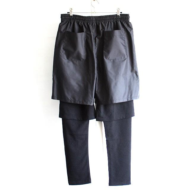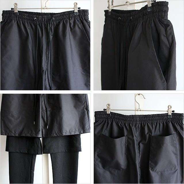 【商品説明】 1枚で完成されたさりげないデザイン性にこだわったレギンスショーツです。 メインショーツは日本製の上質な素材による上品な光沢感とシワになり難いシャリッとした生地感で、 ポリウレタン混紡による適度な伸縮性のあるレギンスが快適な穿き心地を実現しています。 生地の違うレギンスとショーツが一体化しているので、 シンプルに穿くだけでモード感溢れるレイヤードスタイルが組めるようデザインしています。 同じブラックでも生地感を切り替える事でメリハリを生み出していて、 素材的にも視覚的にも絶妙なニュアンスの違いを表現しています。 ウエストはリラックス感のあるゴム仕様をベースにドローコードによる調整も可能で、 高いデザイン性ながら気軽に着回せるように配慮しています。 両サイドとバックのポケットは深く大きめに用意しているので、 機能性においても抜かりなく使いやすさを追求しています。 3段レイヤードによる立体感のあるシルエットはコーデのワンポイントになってくれ、 スニーカー・ブーツともにマッチしてくれるオススメの1枚です。