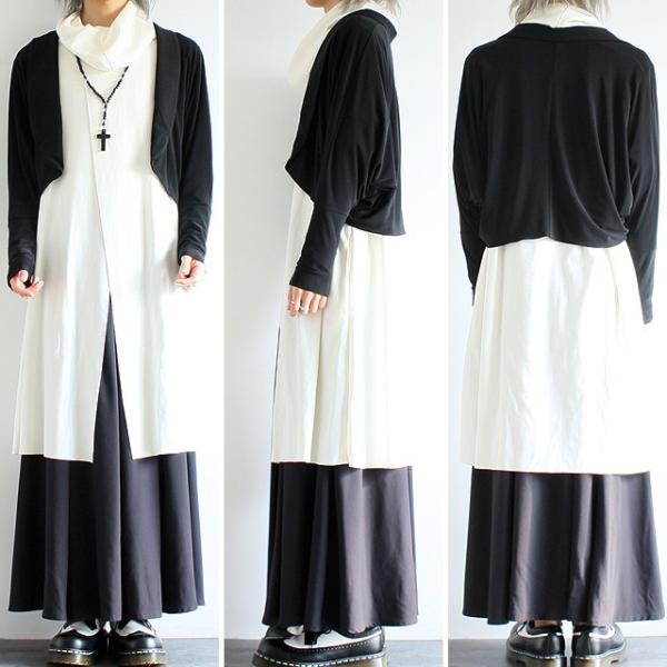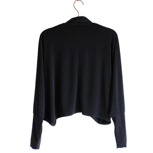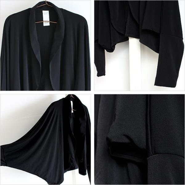 【商品説明】 コンパクトなサイジングにドルマンのゆるさをプラスしたボレロジャケットです。 日本製の上質で柔らかな肌触りと張りのあるさりげない光沢が上品な印象の生地感で、 ポリウレタン混紡による適度なストレッチで快適な着心地を実現しています。 フロントは敢えてボタンを付けないオープン仕様で、 スッキリとした印象のミニマルなデザイン性を追求しています。 ボレロ特有のショート丈に加えかなりコンパクトなサイジングに設定していて、 羽織るだけで絶妙に綺麗なシルエットを表現してくれます。 脇部分にたっぷりと生地をあしらったドルマンスリーブを採用しており、 袖先に掛けて細身にする事でシルエットに遊びを利かせています。 インナーにドレスシャツ等を合わせるとシックにドレスアップされた雰囲気で、 カットソーを合わせればモードとフォーマルのMIXテイストを演出してくれます。 スキニー・レギンス系と合わせてかなりスッキリとしたIラインスタイルはもちろん、 ワイドスラックスとのセットアップやサルエル等ボリュームのあるボトムスとの相性が抜群です。 カッチリとした印象ながらラフな生地感と自然なドレープによる上品な1着です。